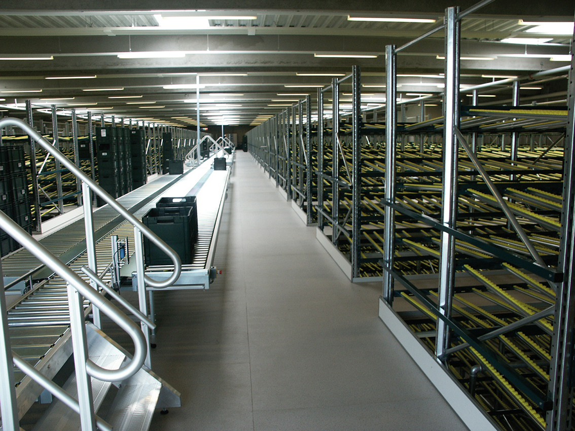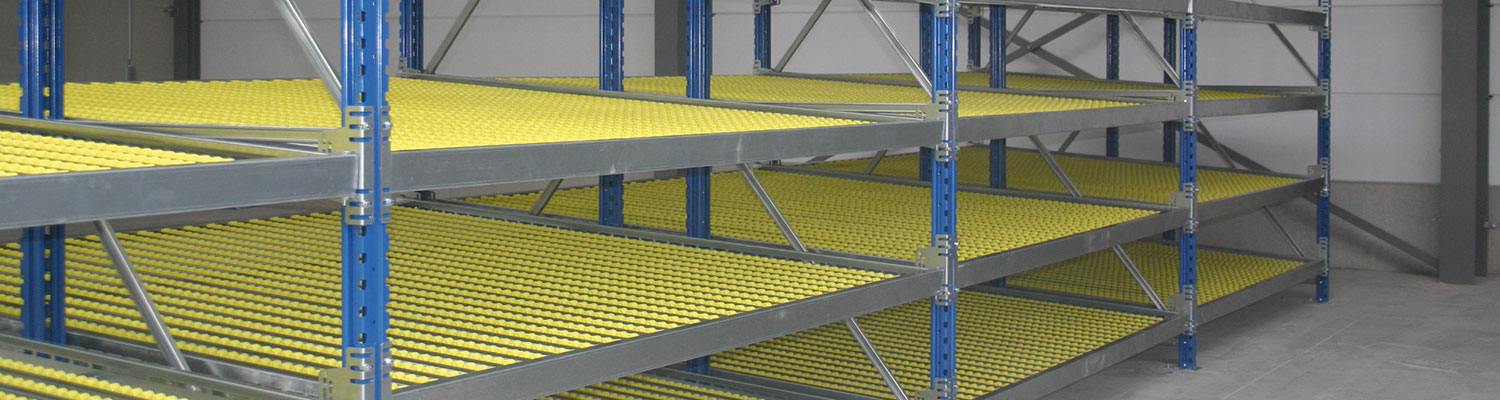 Gre za konvencionalne police, kjer so nameščene “minirail” letve z minimalnim naklonom 3,5 %. Tip koles na letvah izberemo tako, da najbolj ustrezajo vrsti škatle, ki se po njej pomika.